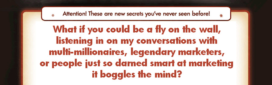 I've spent a lifetime collecting such marketing secrets. But now, instead of having to buy and read thousands of books, network with dozens of multi-million dollar marketers, and marketing legends like I have, criss-cross the globe attending dozens of events -- you can simply BORROW the best ideas I've already discovered for you....almost like a virtual "fly-on-the-wall."